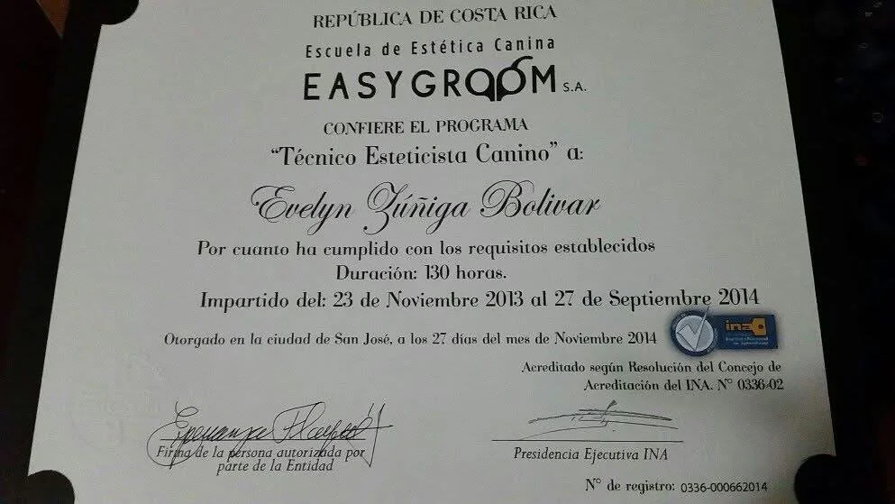 Certificate issues in Costa Rica by “Escuela de Esthetic Canina” (Canine Aesthetic School) - November 2014 - Canine Esthetician Technician.